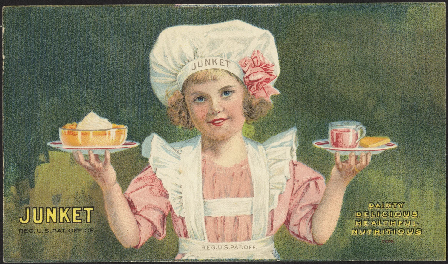 By the 1930s, junket had become a popular convenience food. For many, it was considered a food for the infirm: gentle on digestion for sick children's sensitive stomachs. For others, junket was an easy gateway to making homemade dessert. It's possible that perhaps the manufacturer was going for an elegant, European effect, though; as I learned from this article,