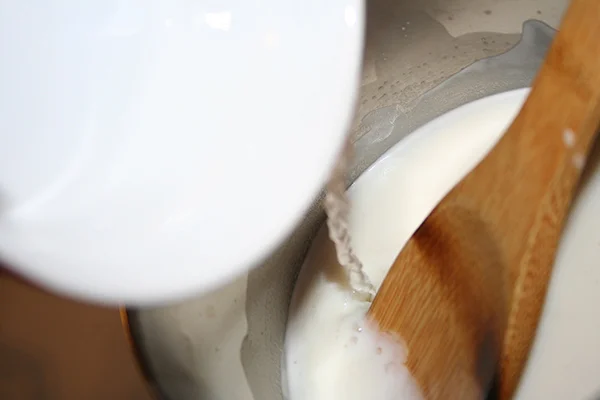 Combine the milk, sugar, and vanilla in a saucepan. Heat on low until the mixture comes to lukewarm (110 degrees).
